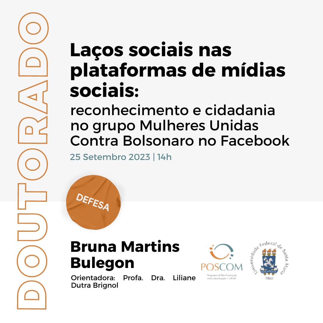 O Programa de Pós-Graduação em Comunicação divulga a banca de defesa de Doutorado da aluna Bruna Matins Bulegon, com o título “Laços sociais nas plataformas de mídias sociais: reconhecimento e cidadania no grupo Mulheres Unidas Contra Bolsonaro no Facebook”, que ocorrerá no dia 25 de Setembro, às 14 horas.