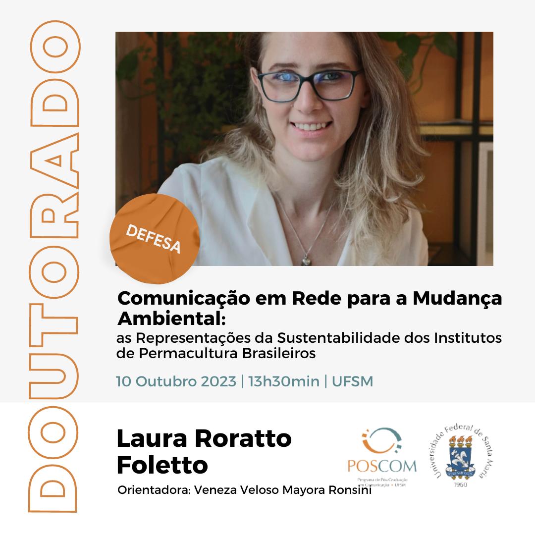O Programa de Pós-Graduação em Comunicação divulga a banca de defesa de doutorado da aluna Laura Roratto Foletto, com o título “Comunicação em Rede para a Mudança Ambiental: As Representações da Sustentabilidade dos Institutos de Permacultura Brasileiros”, que ocorrerá no dia 6 de outubro, às 13h30min.