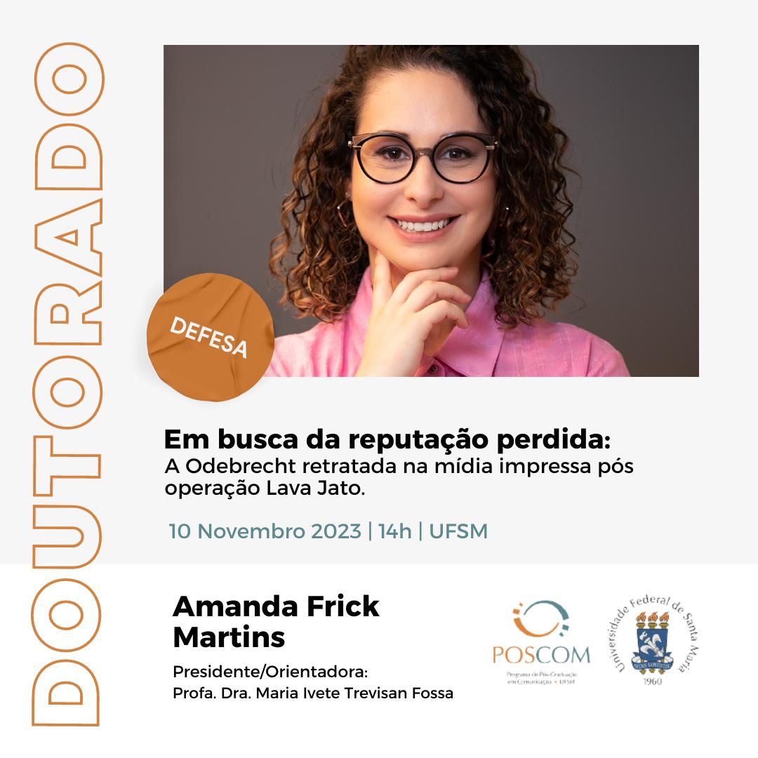 O Programa de Pós-Graduação em Comunicação divulga a banca de defesa de doutorado da aluna Amanda Frick Martins, com o título “Em busca da reputação perdida: A Odebrecht retratada na mídia impressa pós operação Lava Jato”, que ocorrerá no dia 10 de Novembro, às 14 horas.
