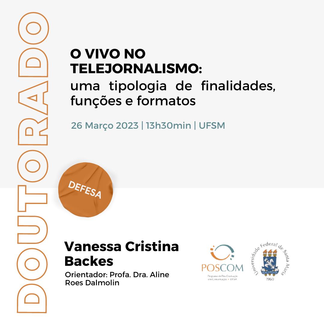 O Programa de Pós-Graduação em Comunicação divulga a banca de defesa de doutorado da aluna Vanessa Cristina Backes, com o título “O VIVO NO TELEJORNALISMO: uma tipologia de finalidades, funções e formatos”, que ocorrerá no dia 26 de Março, às 13h30min.