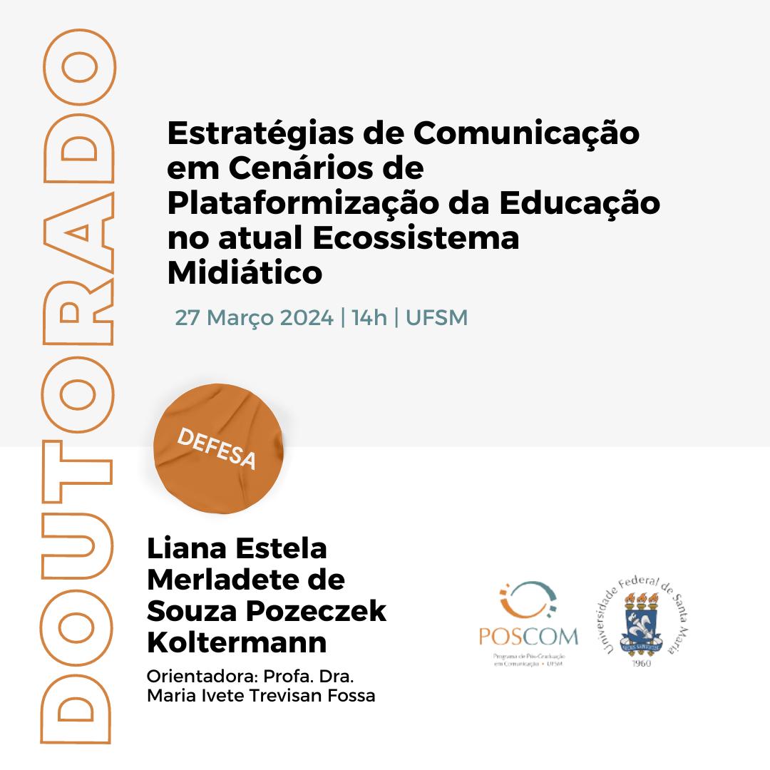 O Programa de Pós-Graduação em Comunicação divulga a banca de defesa de doutorado da aluna Liana Estela Merladete de Souza Pozeczek Koltermann, com o título “Estratégias de Comunicação em Cenários de Plataformização da Educação no atual Ecossistema Midiático”, que ocorrerá no dia 27 de Março, às 14h00min.