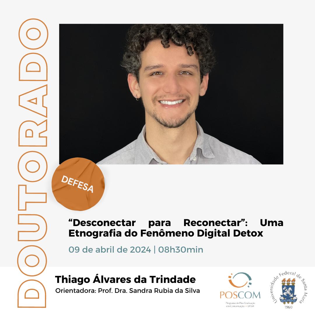 O Programa de Pós-Graduação em Comunicação divulga a banca de defesa de doutorado do aluno Thiago Álvares da Trindade, com o título “ “Desconectar para Reconectar”: Uma Etnografia do Fenômeno Digital Detox”, que ocorrerá no dia 09 de Abril, às 08h 30min.