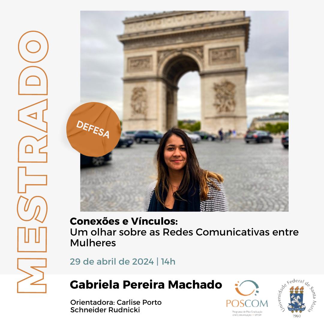 O Programa de Pós-Graduação em Comunicação divulga a banca de defesa de mestrado da aluna Gabriela Pereira Machado, com o título “Conexões e Vínculos: Um olhar sobre as Redes Comunicativas entre Mulheres”, que ocorrerá no dia 29 de abril, às 14 horas. Para solicitar acesso à sala de videoconferência, envie e-mail, com antecedência, para gabriela-machado.gm@acad.ufsm.br.