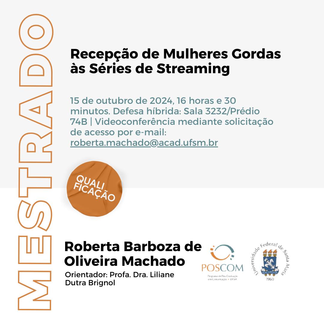 Programa de Pós-Graduação em Comunicação divulga a banca de Qualificação de Mestrado da aluna Roberta Barboza de Oliveira Machado, com o título “Recepção de Mulheres Gordas às Séries de Streaming”, que ocorrerá no dia 15 de outubro, às 16 horas e 30 minutos de forma híbrida, na sala 3232, prédio 74B. Acesso à videoconferência mediante solicitação por e-mail: roberta.machado@acad.ufsm.br