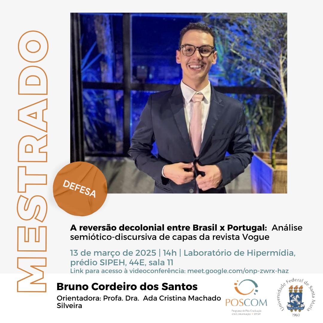 O Programa de Pós-Graduação em Comunicação divulga a banca de defesa de mestrado do aluno Bruno Cordeiro dos Santos, com o título “A reversão decolonial entre Brasil x Portugal: análise semiótico-discursiva de capas da revista Vogue“, que ocorrerá no dia 13 de março de 2025, às 14 horas, no Laboratório de Hipermídia, prédio SIPEH, 44E, sala 11. Link para acesso à videoconferência: http://meet.google.com/onp-zwrx-haz.