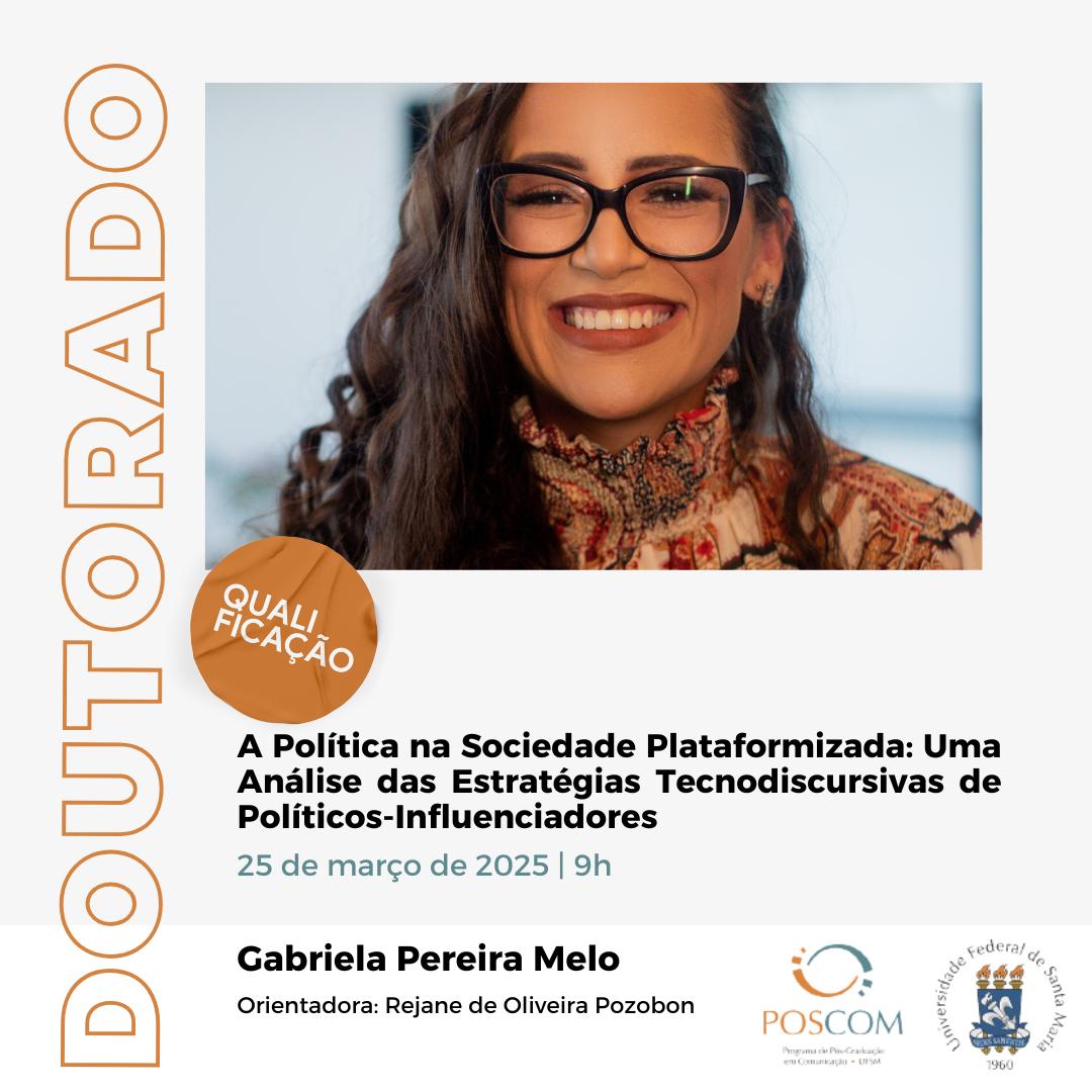 O Programa de Pós-Graduação em Comunicação divulga a banca de qualificação de doutorado da aluna Gabriela Pereira Melo, com o título “A Política na Sociedade Plataformizada: Uma Análise das Estratégias Tecnodiscursivas de Políticos-Influenciadores“, que ocorrerá no dia 25 de março de 2025, às 9 horas, por videoconferência. Para ter acesso à sala de defesa, favor solicitar o link através do e-mail: gabriela.melo@acad.ufsm.br.