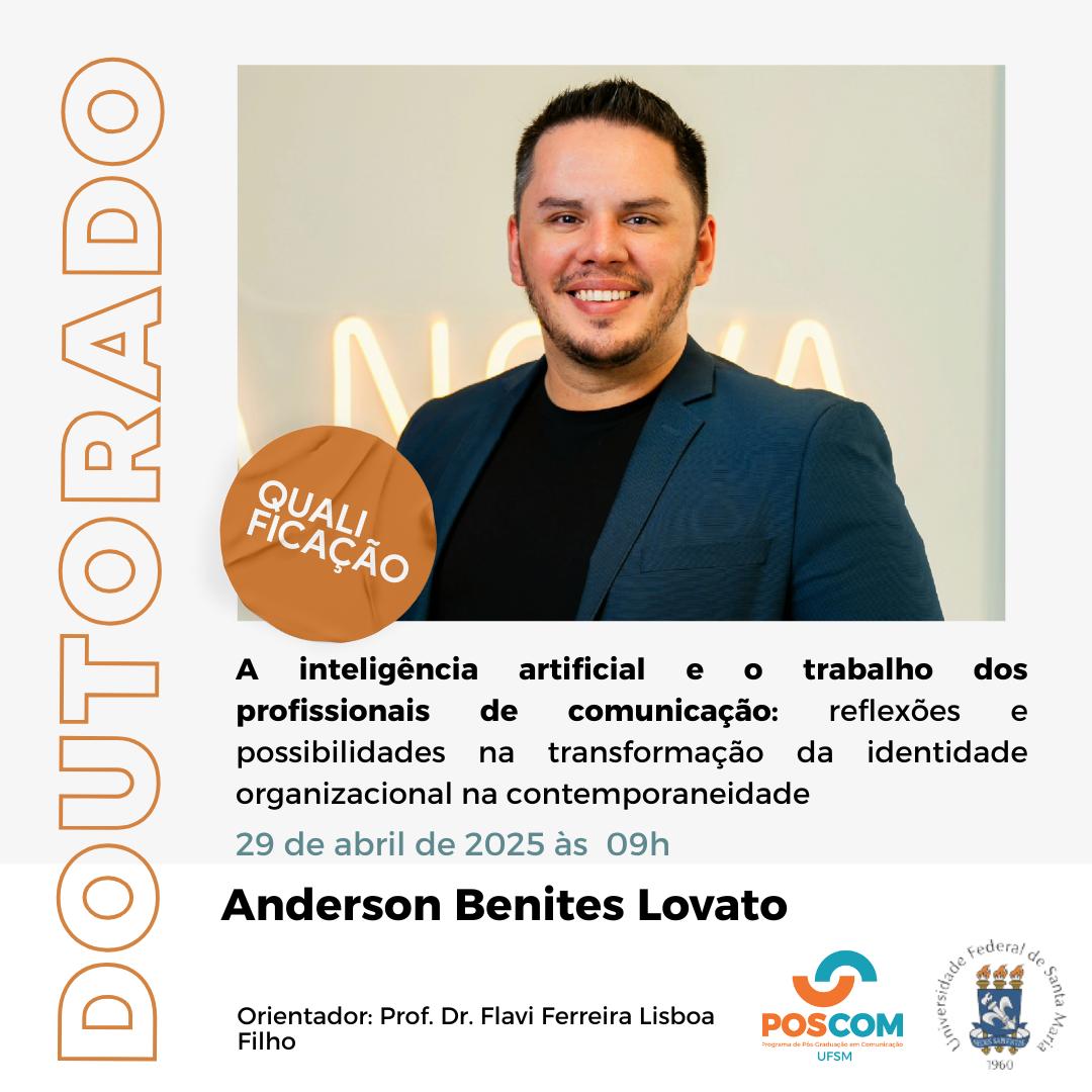 O Programa de Pós-Graduação em Comunicação divulga a banca de qualificação de doutorado do aluno Anderson Benites Lovato, com o título “A inteligência artificial e o trabalho dos profissionais de comunicação: reflexões e possibilidades na transformação da identidade organizacional na contemporaneidade”, que ocorrerá no dia 29 de abril de 2025, às 9 horas.