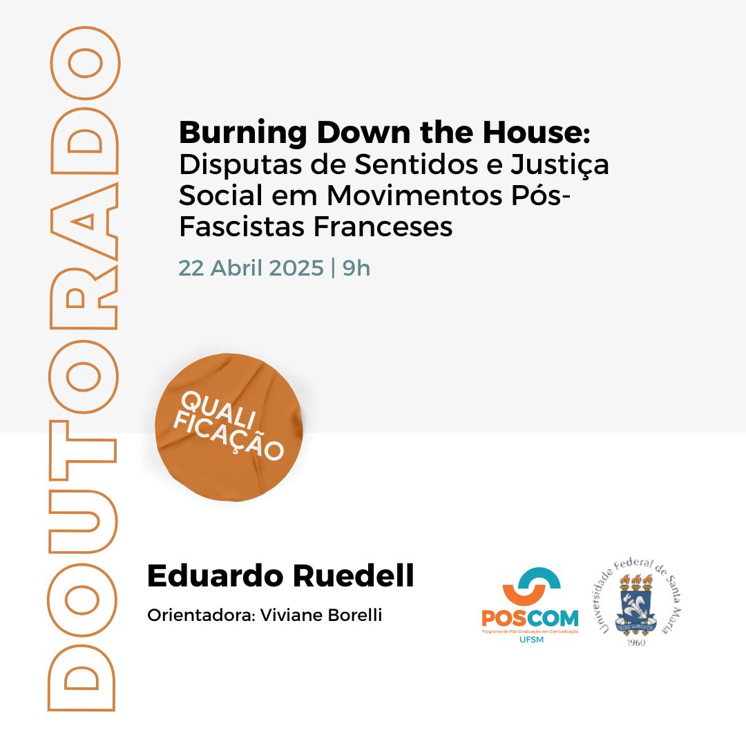 O Programa de Pós-Graduação em Comunicação divulga a banca de qualificação de doutorado do aluno Eduardo Ruedell, com o título “Burning Down the House: Disputas de Sentidos e Justiça Social em Movimentos Pós-Fascistas Franceses“, que ocorrerá no dia 22 de abril de 2025, às 9 horas.