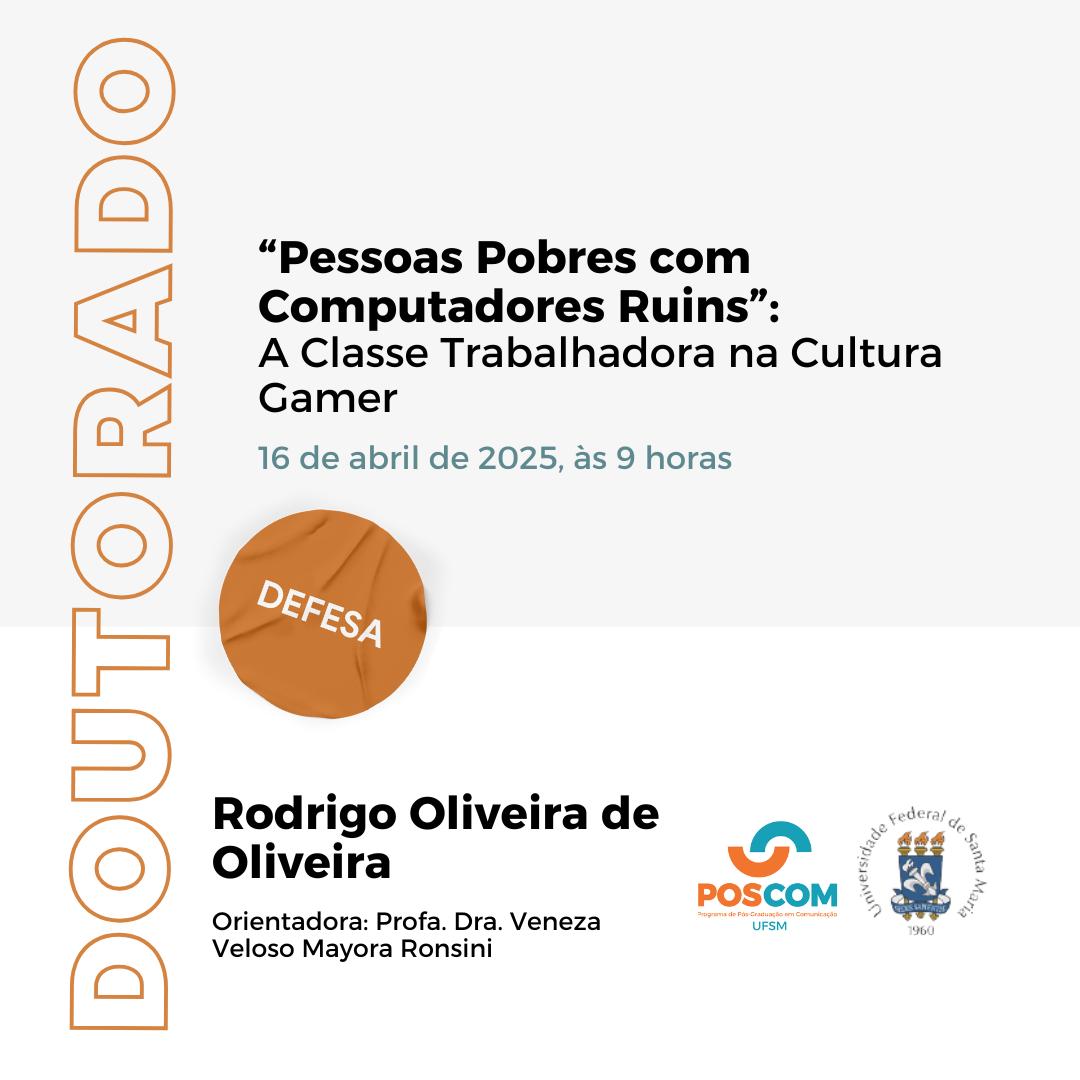 O Programa de Pós-Graduação em Comunicação divulga a banca de defesa de doutorado do aluno Rodrigo Oliveira de Oliveira, com o título “Pessoas Pobres com Computadores Ruins”: A Classe Trabalhadora na Cultura Gamer” que ocorrerá no dia 16 de abril de 2025, às 09 horas.