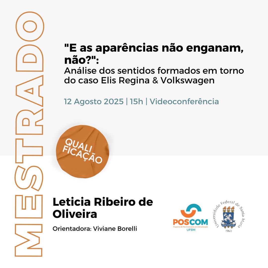 O Programa de Pós-Graduação em Comunicação divulga a banca de qualificação de mestrado da aluna Leticia Ribeiro de Oliveira, com o título “’E as aparências não enganam, não?’: Análise dos sentidos formados em torno do caso elis regina & volkswagen”, que ocorrerá no dia 12 de agosto de 2025, às 15 horas, por videoconferência. Para acesso à sala virtual, solicitar por e-mail para ribeiro.leticia@acad.ufsm.br.