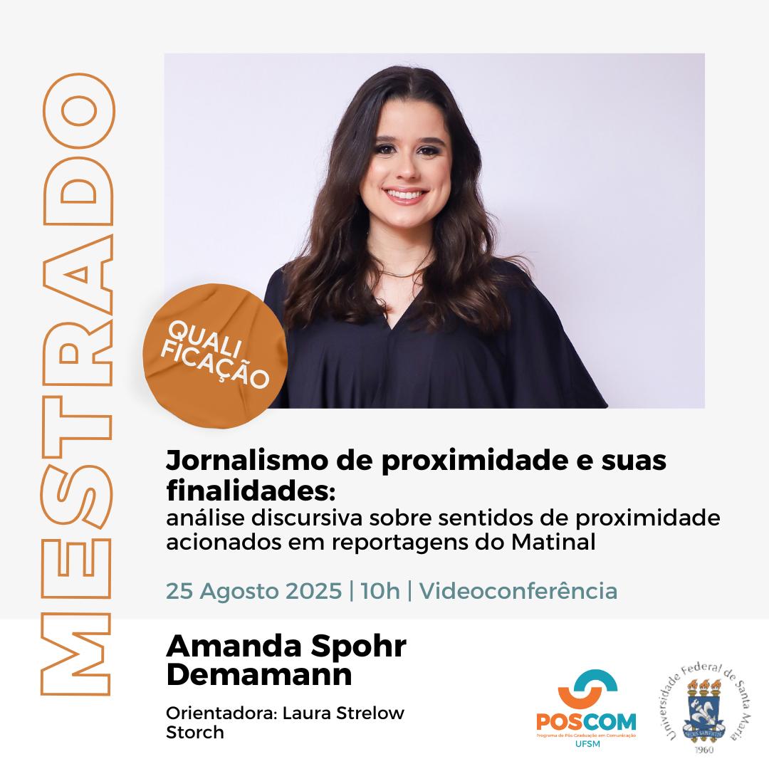 O Programa de Pós-Graduação em Comunicação divulga a banca de qualificação de mestrado da aluna Amanda Spohr Demamann, com o título “Jornalismo de proximidade e suas finalidades: análise discursiva sobre sentidos de proximidade acionados em reportagens do Matinal”, que ocorrerá no dia 25 de agosto de 2025, às 10 horas, por videoconferência. Para acesso à sala virtual, solicitar por e-mail para ejor@ufsm.br.
