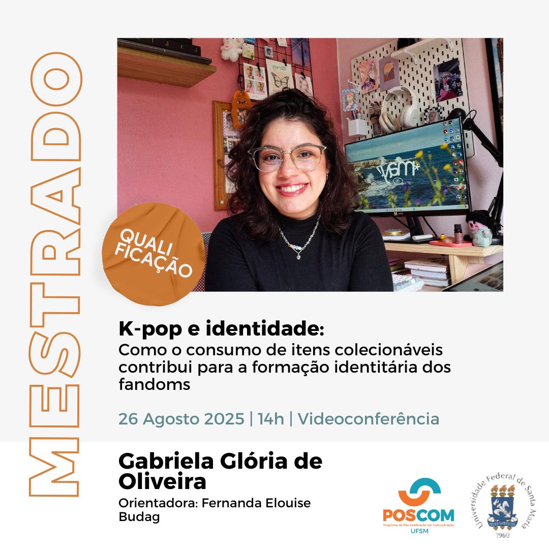 O Programa de Pós-Graduação em Comunicação divulga a banca de qualificação de mestrado da aluna Gabriela Glória de Oliveira, com o título “K-pop e identidade: Como o consumo de itens colecionáveis contribui para a formação identitária dos fandoms”, que ocorrerá no dia 26 de agosto de 2025, às 14 horas, por videoconferência. Para acesso à sala virtual, solicitar por e-mail para gabriela.gloria@acad.ufsm.br.