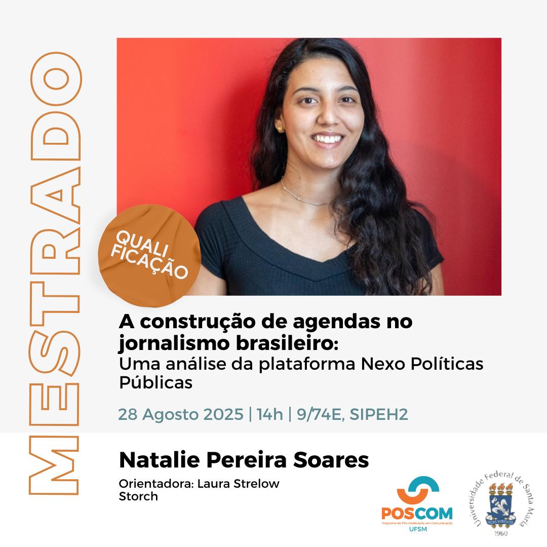 O Programa de Pós-Graduação em Comunicação divulga a banca de qualificação de mestrado da aluna Natalie Pereira Soares, com o título “A construção de agendas no jornalismo brasileiro: Uma análise da plataforma Nexo Políticas Públicas”, que ocorrerá no dia 28 de agosto de 2025, às 14 horas, na sala 9 do prédio 74E, SIPEH2.