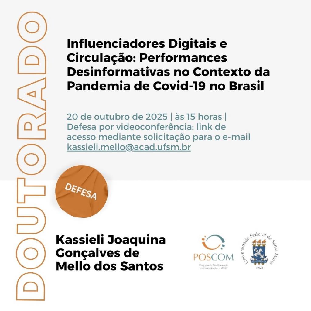 O Programa de Pós-Graduação em Comunicação divulga a banca de defesa de doutorado da aluna Kassieli Joaquina Gonçalves de Mello dos Santos, com o título “Influenciadores Digitais e Circulação: Performances Desinformativas no Contexto da Pandemia de Covid-19 no Brasil”, que ocorrerá no dia 20 de outubro de 2025, às 15 horas. de forma online.