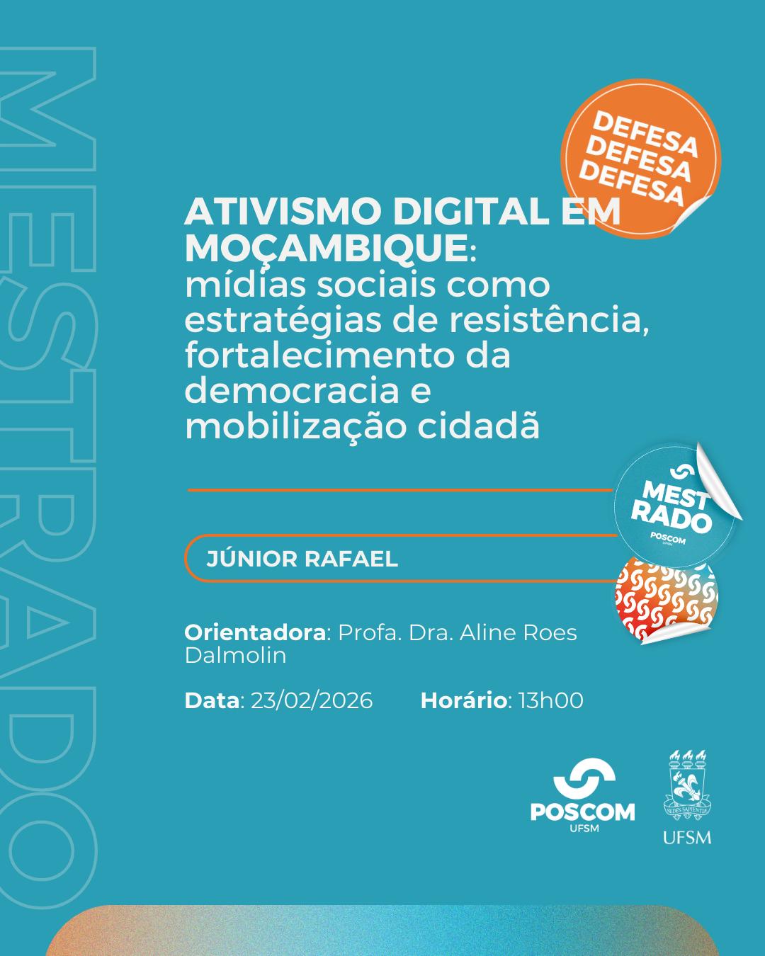 O Programa de Pós-Graduação em Comunicação divulga a banca de defesa de mestrado do aluno Júnior Rafael, com o título “Ativismo Digital em Moçambique: mídias sociais como estratégias de resistência, fortalecimento da democracia e mobilização cidadã”, que ocorrerá no dia 23 de fevereiro de 2026, às 13 horas, de forma online. Para acesso à sala de videoconferência, solicitar por e-mail para junior.rafael@acad.ufsm.br até o dia 21/02/2026.