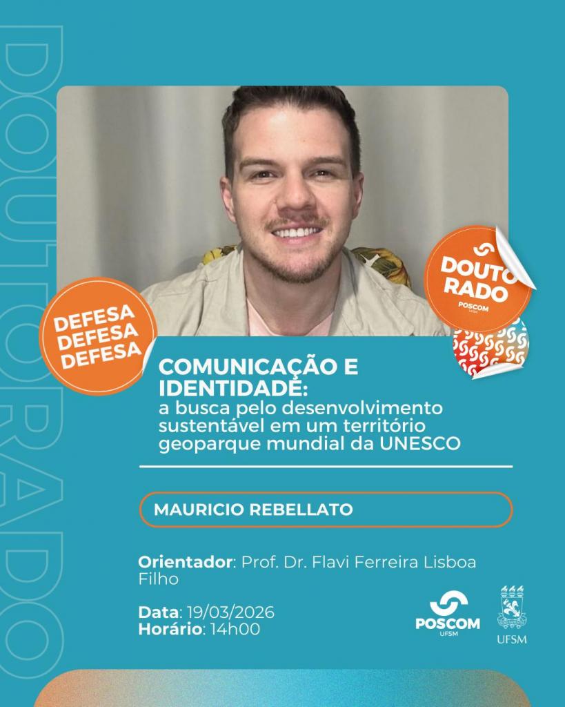 O Programa de Pós-Graduação em Comunicação divulga a banca de defesa de doutorado do aluno Mauricio Rebellato, com o título “Comunicação e Identidade: A Busca pelo Desenvolvimento Sustentável em um Território Geoparque Mundial da UNESCO”, que ocorrerá no dia 19 de março de 2026, às 14 horas, na sala 3232 do prédio 74B, e de forma online. Para acesso à sala de videoconferência, solicitar por e-mail para mauricio.rebellato@acad.ufsm.br.