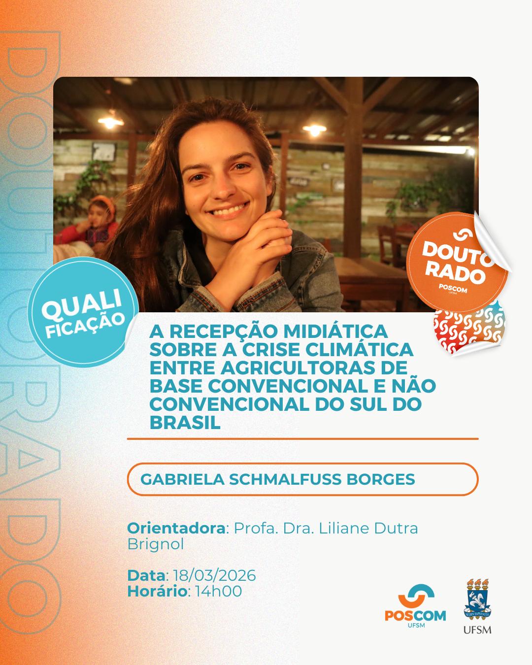 O Programa de Pós-Graduação em Comunicação divulga a banca de qualificação de doutorado da aluna Gabriela Schmalfuss Borges, com o título “A Recepção Midiática sobre a Crise Climática entre Agricultoras de Base Convencional e Não Convencional do Sul do Brasil”, que ocorrerá no dia 18 de março de 2026, às 14 horas, de forma online. Para acesso à sala de videoconferência, solicitar por e-mail para gabischmalfuss@gmail.com até o dia 17/03/2026.