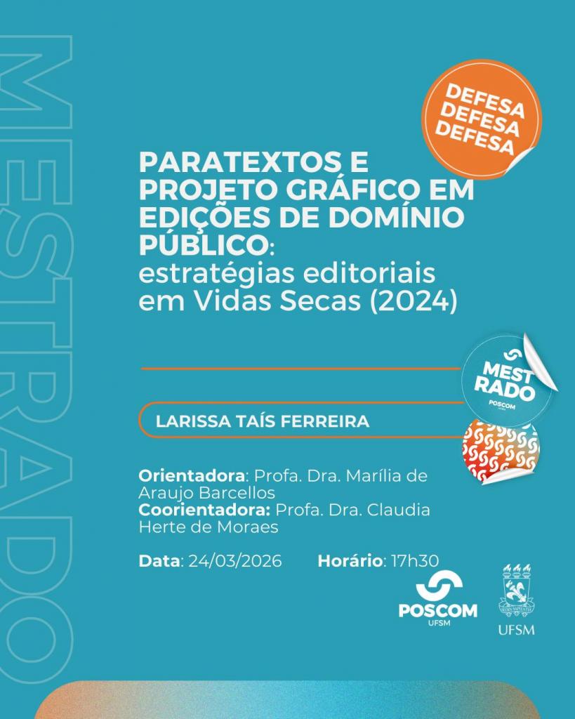 O Programa de Pós-Graduação em Comunicação divulga a banca de defesa de mestrado da aluna Larissa Taís Ferreira, com o título “Paratextos e projeto gráfico em edições de domínio público: estratégias editoriais em Vidas Secas (2024)”, que ocorrerá no dia 24 de março de 2026, às 17 horas e 30 minutos, de forma online. Para acesso à sala de videoconferência, solicitar por e-mail para larissa.ferreira@acad.ufsm.br.