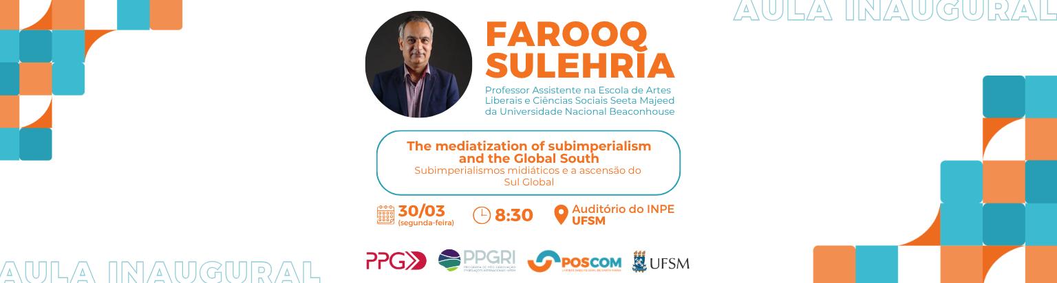 No dia 30 de março de 2026, acontecerá a aula inaugural do ano letivo “The mediatization of subimperialism and the Global South”, promovida pelos Programas de Pós-Graduação em Comunicação (Poscom), em Direito (PPGD) e em Relações Internacionais (PPGRI), da Universidade Federal de Santa Maria (UFSM). O título do evento faz referência ao recente livro do pesquisador paquistanês doutor Farooq Sulehria, que será o ministrante. O momento está previsto para às 8h30, no auditório do Instituto Nacional de Pesquisas Espaciais (INPE/UFSM).