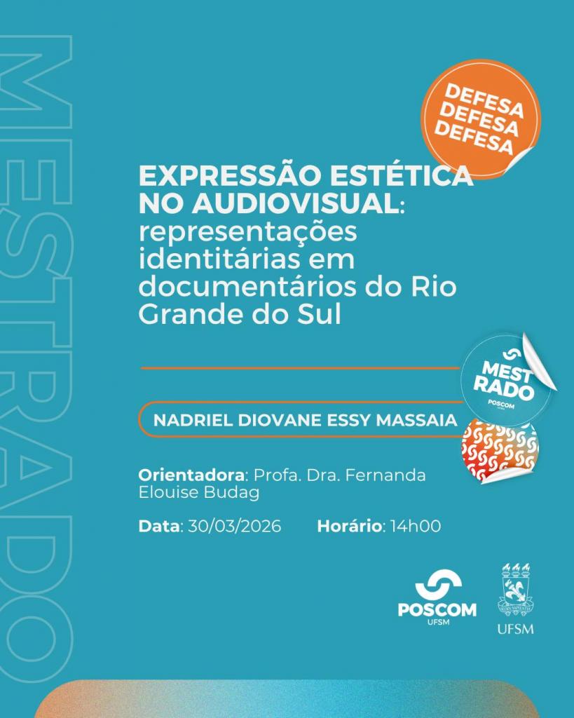 O Programa de Pós-Graduação em Comunicação divulga a banca de defesa de mestrado do aluno Nadriel Diovane Essy Massaia, com o título “Expressão Estética no Audiovisual: Representações Identitárias em Documentários do Rio Grande do Sul”, que ocorrerá no dia 30 de março de 2026, às 14 horas, de forma online. Para acesso à sala de videoconferência, solicitar por e-mail para fernanda.budag@ufsm.br até o dia 29/03/2026.