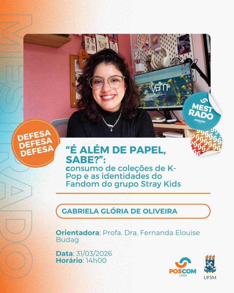 O Programa de Pós-Graduação em Comunicação divulga a banca de defesa de mestrado da aluna Gabriela Glória de Oliveira, com o título “’É Além de Papel, Sabe?’: Consumo de Coleções de K-Pop e as Identidades do Fandom do Grupo Stray Kids”, que ocorrerá no dia 31 de março de 2026, às 14 horas, de forma online. Para acesso à sala de videoconferência, solicitar por e-mail para fernanda.budag@ufsm.br até 30/03/2026.