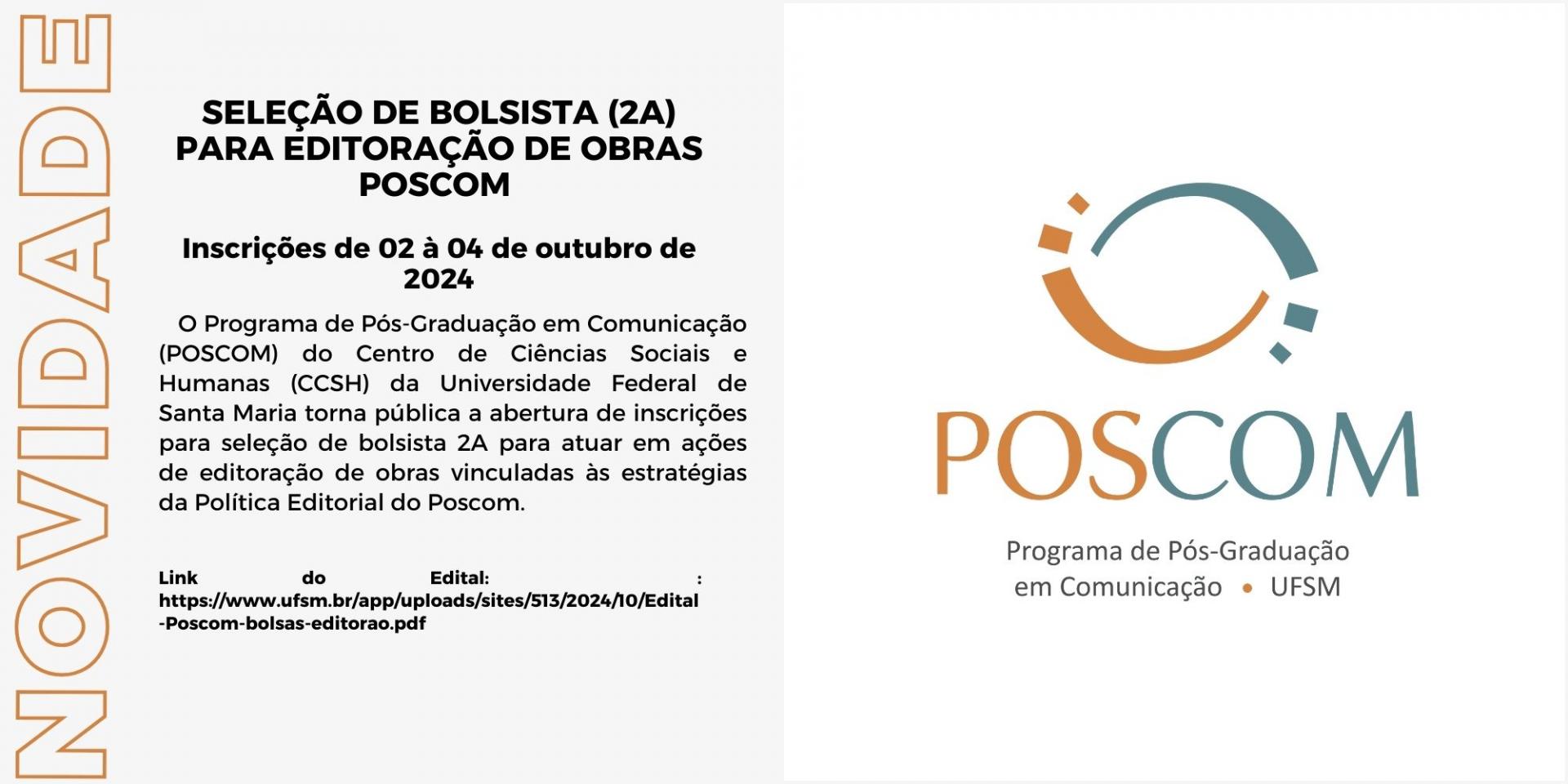 Edital Processo Seletivo Mestrado e Doutorado do POSCOM 2025/2 ingresso em 2026/1O Programa de Pós-Graduação em Comunicação (Poscom) da Universidade Federal de Santa Maria (UFSM) torna pública a abertura de inscrições para o [...]