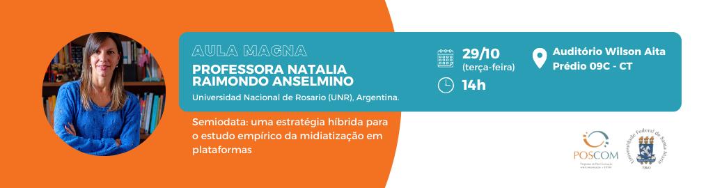 O Programa de Pós-Graduação em Comunicação (POSCOM/UFSM) realizará a Aula Magna de 2024 no dia 29 de outubro, às 14h, no Auditório Wilson Aita (Prédio 09C do Centro de Tecnologia). A aula será ministrada pela professora Natalia Raimondo Anselmino, da Universidad Nacional de Rosario (UNR), Argentina, com o tema “Semiodata: uma estratégia híbrida para o estudo empírico da midiatização em plataformas”. As inscrições podem ser realizadas pelo formulário.