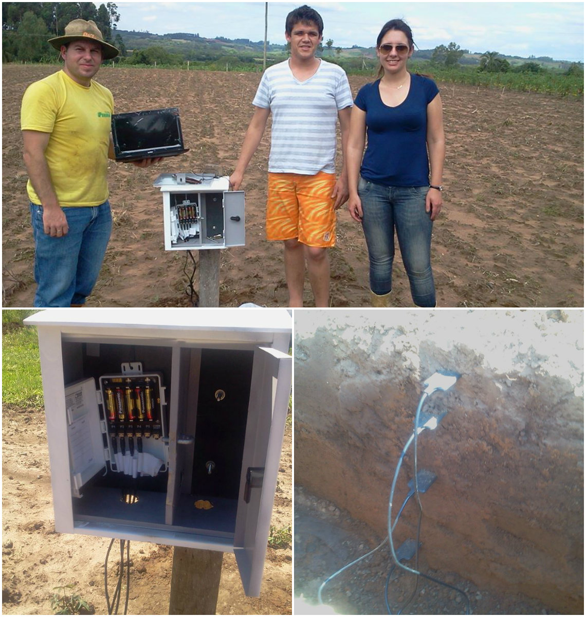 No dia 31 de outubro de 2014 foram instaladas as sondas para registro da umidade do solo em uma lavoura comercial com a cultivar São José no município de Vera Cruz-RS. O mesmo equipamento foi instalado no dia 27 de outubro de 2014 no experimento conduzido no Departamento de Fitotecnia na UFSM, na parcela da cultivar São José. Será monitorado o conteúdo de água no solo em diferentes profundidades a cada 20 minutos, para calibração e teste de dois modelos de balanço hídrico no solo.