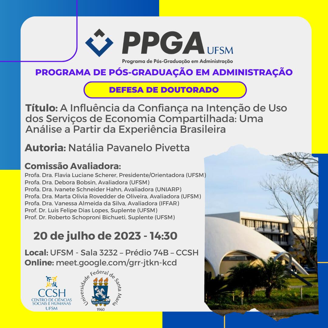 O Programa de Pós-Graduação em Administração divulga a Defesa de Doutorado da aluna Natália Pavanelo Pivetta, com o título “A Influência da Confiança na Intenção de Uso dos Serviços de Economia Compartilhada: Uma Análise a Partir da Experiência Brasileira” que ocorrerá no dia 20 de julho de 2023, às 14:30, na UFSM – Sala 3232, Prédio 74 B, CCSH.