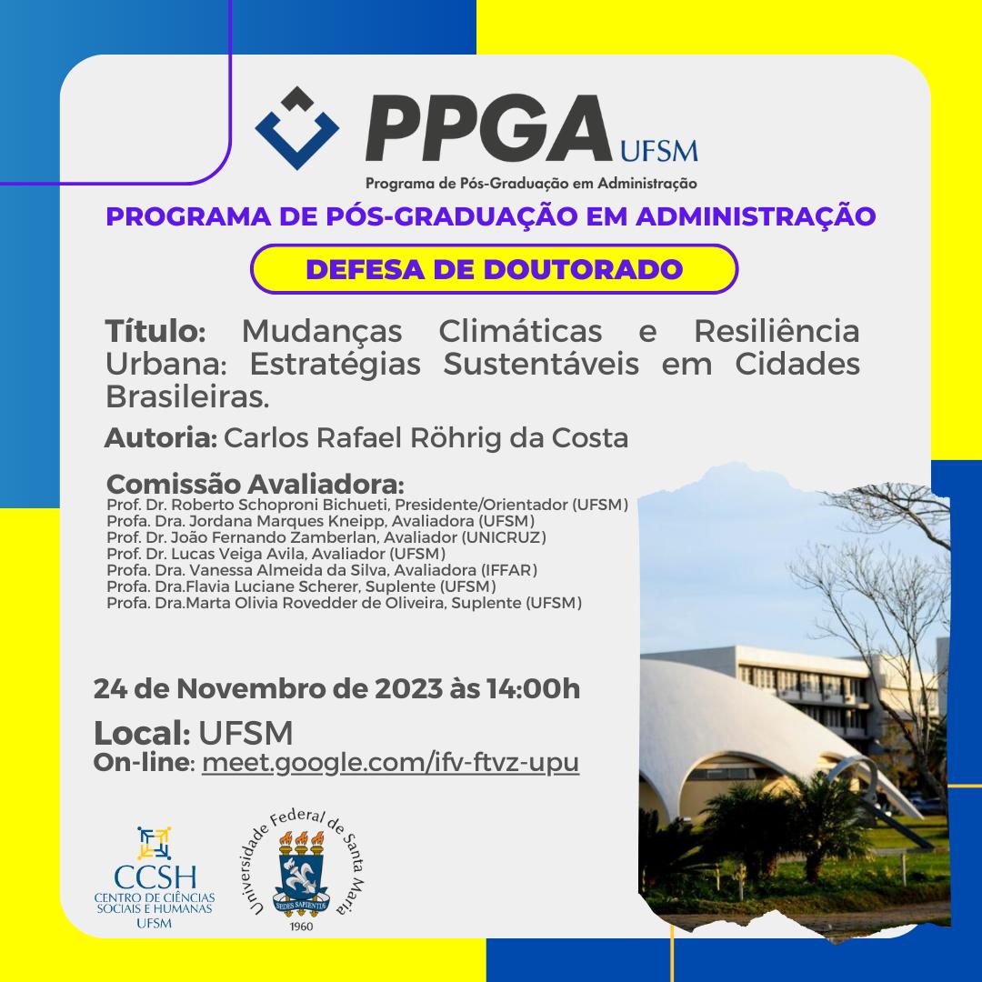 O Programa de Pós-Graduação em Administração divulga a banca de defesa de doutorado do aluno Carlos Rafael Röhrig da Costa, com o título “Mudanças Climáticas e Resiliência Urbana: Estratégias Sustentáveis em Cidades Brasileiras”, que ocorrerá no dia 24 de novembro, às 14 horas. Link para acesso à videoconferência: http://meet.google.com/ifv-ftvz-upu.