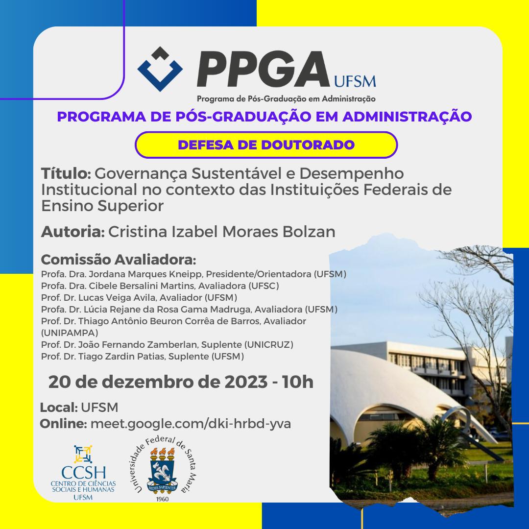 O Programa de Pós-Graduação em Administração divulga a banca de defesa de doutorado da aluna Cristina Izabel Moraes Bolzan, com o título “Governança Sustentável e Desempenho Institucional no contexto das Instituições Federais de Ensino Superior”, que ocorrerá no dia 20 de dezembro, às 10 horas. Link para acesso à videoconferência: http://meet.google.com/dki-hrbd-yva.