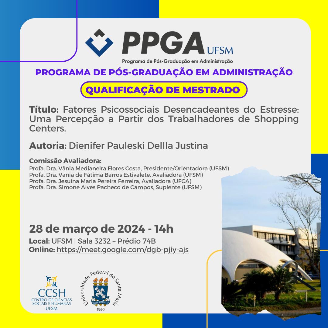 O Programa de Pós-Graduação em Administração divulga a banca de qualificação de mestrado da aluna Dienifer Pauleski Dellla Justina, com o título “Fatores Psicossociais Desencadeantes do Estresse: Uma Percepção a Partir dos Trabalhadores de Shopping Centers“, que ocorrerá no dia 28 de março de 2024, às 11 horas, na sala 3232 do prédio 74B, CCSH/UFSM.