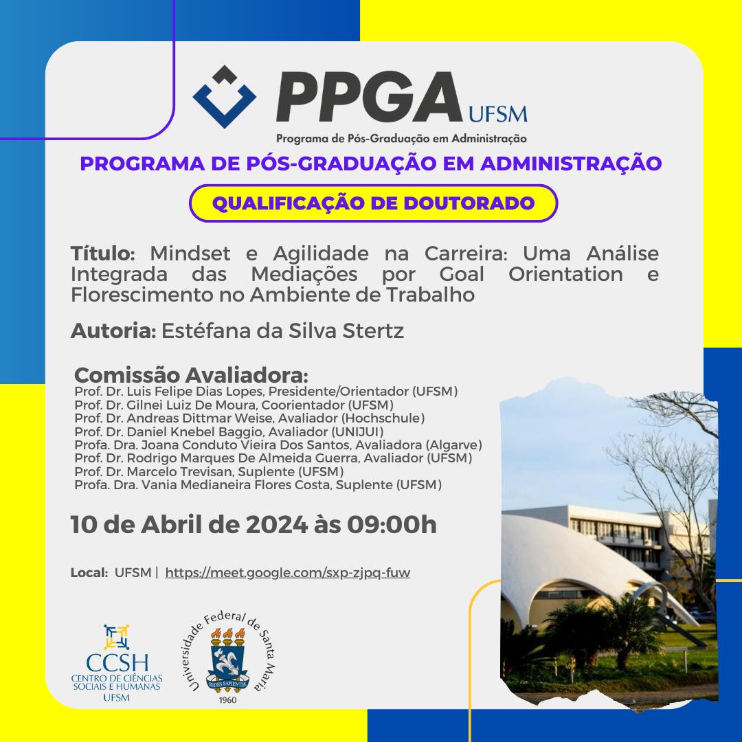 O Programa de Pós-Graduação em Administração divulga a banca de qualificação de doutorado da aluna  Estéfana da Silva Stertz , com o título “ Mindset e Agilidade na Carreira: Uma Análise Integrada das Mediações por Goal Orientation e Florescimento no Ambiente de Trabalho“, que ocorrerá no dia 10 de abril de 2024, às 09 horas, na UFSM.