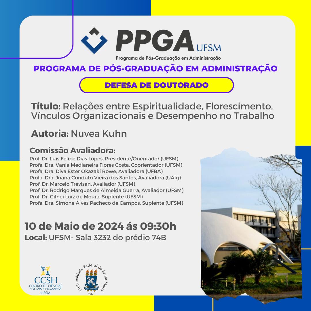 O Programa de Pós-Graduação em Administração divulga a banca de Defesa de doutorado da aluna  Nuvea Kuhn, com o título “Relações entre Espiritualidade, Florescimento, Vínculos Organizacionais e Desempenho no Trabalho“, que ocorrerá no dia 10 de maio de 2024, às 09h30min, na UFSM – Sala 3232 do prédio 74B.