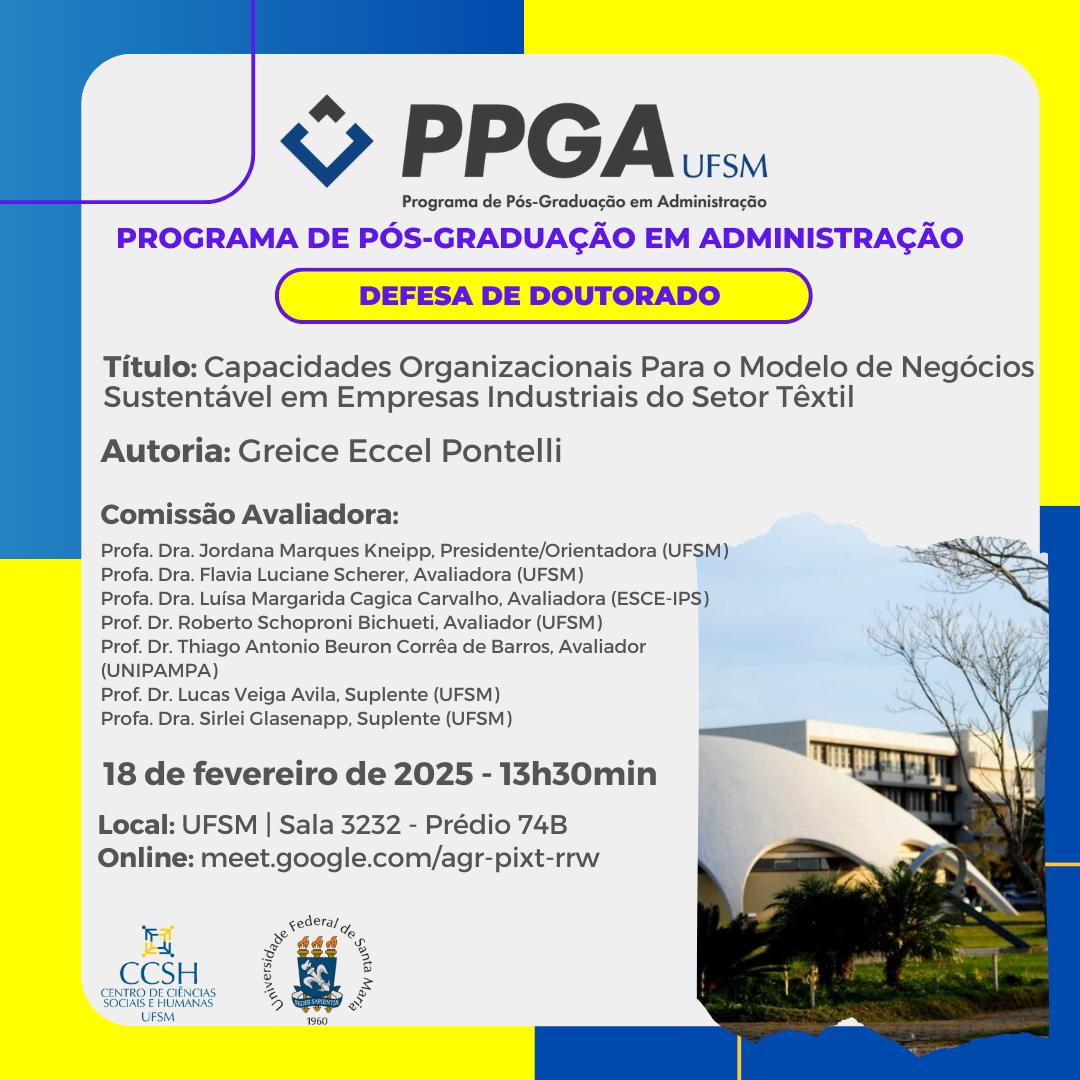O Programa de Pós-Graduação em Administração divulga a banca de defesa de doutorado da aluna Greice Eccel Pontelli, com o título “Capacidades Organizacionais Para o Modelo de Negócios Sustentável em Empresas Industriais do Setor Têxtil“, que ocorrerá no dia 18 de fevereiro de 2025, às 13 horas e 30 minutos, na sala 3232 do prédio 74B, CCSH/UFSM, e também por videoconferência, através do link: https://meet.google.com/agr-pixt-rrw.