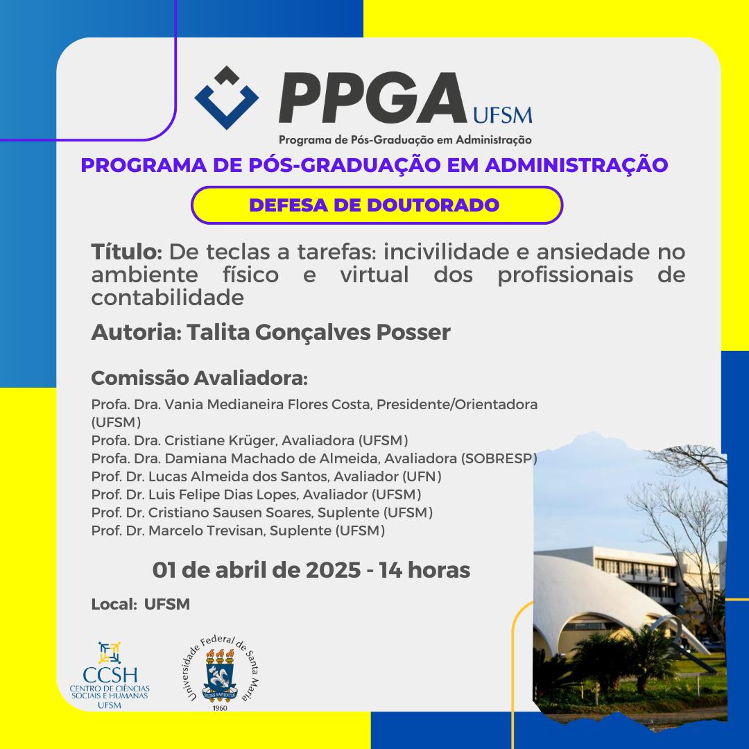 O Programa de Pós-Graduação em Administração divulga a banca de defesa de doutorado da aluna Talita Gonçalves Posser, com o título “De teclas a tarefas: incivilidade e ansiedade no ambiente físico e virtual dos profissionais de contabilidade“, que ocorrerá no dia 01 de abril de 2025, às 14 horas.