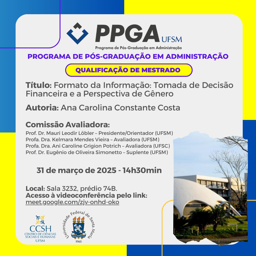 O Programa de Pós-Graduação em Administração divulga a banca de qualificação de mestrado da aluna Ana Carolina Constante Costa, com o título “Formato da Informação: Tomada de Decisão Financeira e a Perspectiva de Gênero“, que ocorrerá no dia 31 de março de 2025, às 14 horas e 30 minutos, na sala 3232 do prédio 74B, e de forma online.