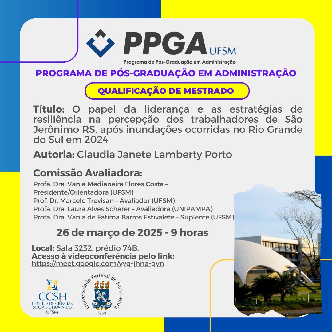 O Programa de Pós-Graduação em Administração divulga a banca de qualificação de mestrado da aluna Claudia Janete Lamberty Porto, com o título “O papel da liderança e as estratégias de resiliência na percepção dos trabalhadores de São Jerônimo RS, após inundações ocorridas no Rio Grande do Sul em 2024“, que ocorrerá no dia 26 de março de 2025, às 9 horas, na sala 3232 do prédio 74B, e de forma online.