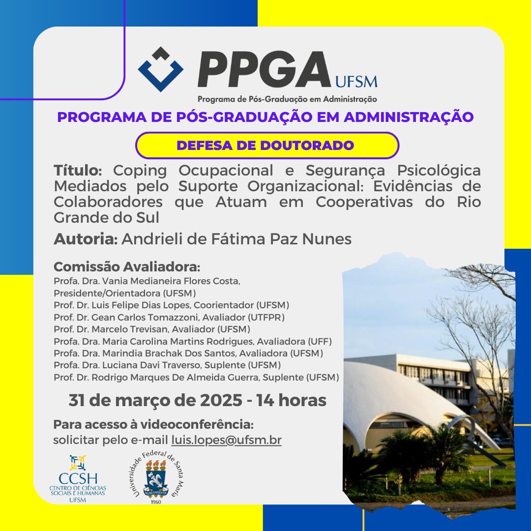 O Programa de Pós-Graduação em Administração divulga a banca de defesa de doutorado da aluna Andrieli de Fátima Paz Nunes, com o título “Coping Ocupacional e Segurança Psicológica Mediados pelo Suporte Organizacional: Evidências de Colaboradores que Atuam em Cooperativas do Rio Grande do Sul“, que ocorrerá no dia 31 de março de 2025, às 14 horas, por videoconferência. Solicitar acesso à sala virtual pelo e-mail luis.lopes@ufsm.br.