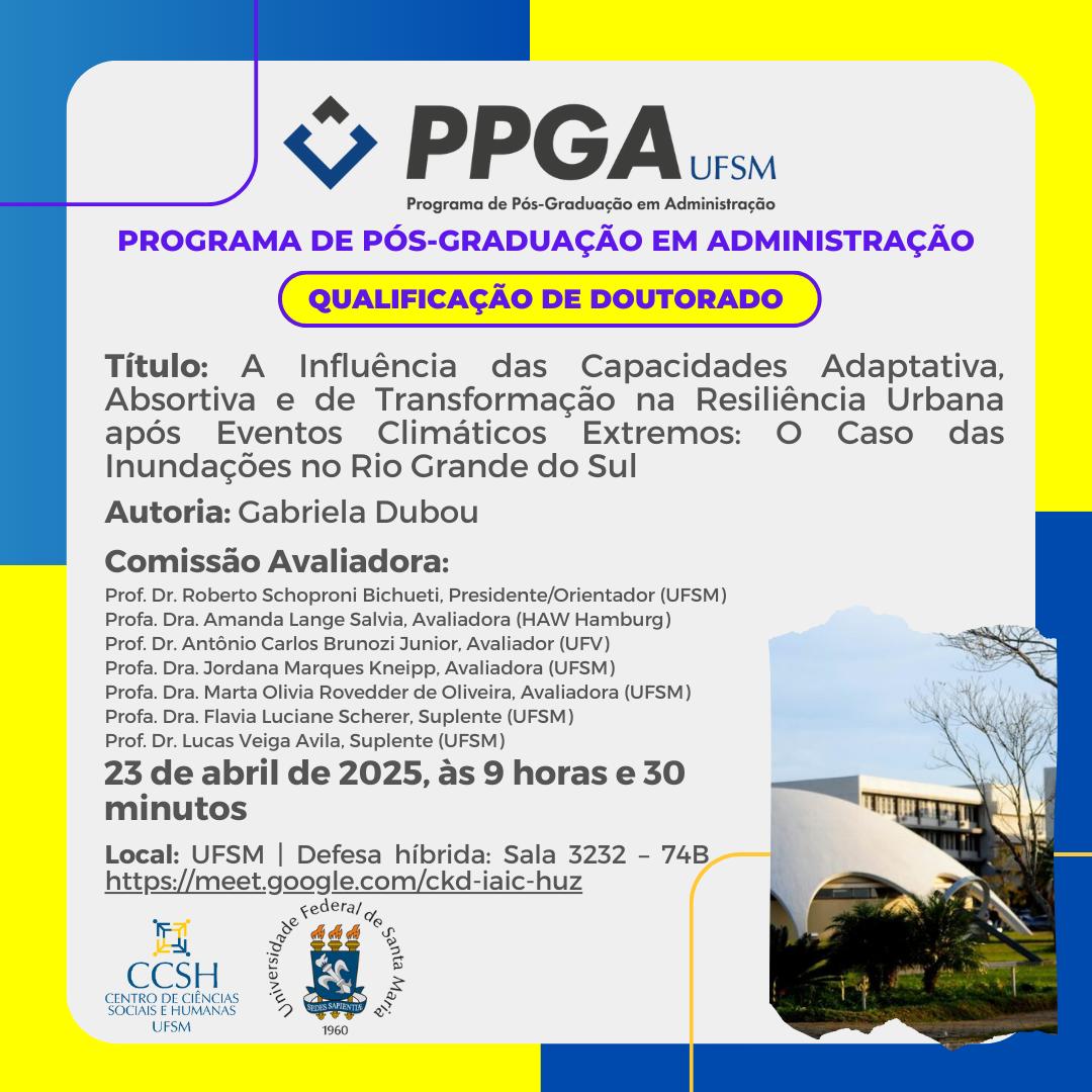 O Programa de Pós-Graduação em Administração divulga a banca de qualificação de doutorado da aluna Gabriela Dubou, com o título “A Influência das Capacidades Adaptativa, Absortiva e de Transformação na Resiliência Urbana após Eventos Climáticos Extremos: O Caso das Inundações no Rio Grande do Sul“, que ocorrerá no dia 23 de abril de 2025, às 9 horas e 30 minutos, de forma híbrida, na sala 3232 do prédio 74B, e por videoconferência, pelo link: https://meet.google.com/ckd-iaic-huz