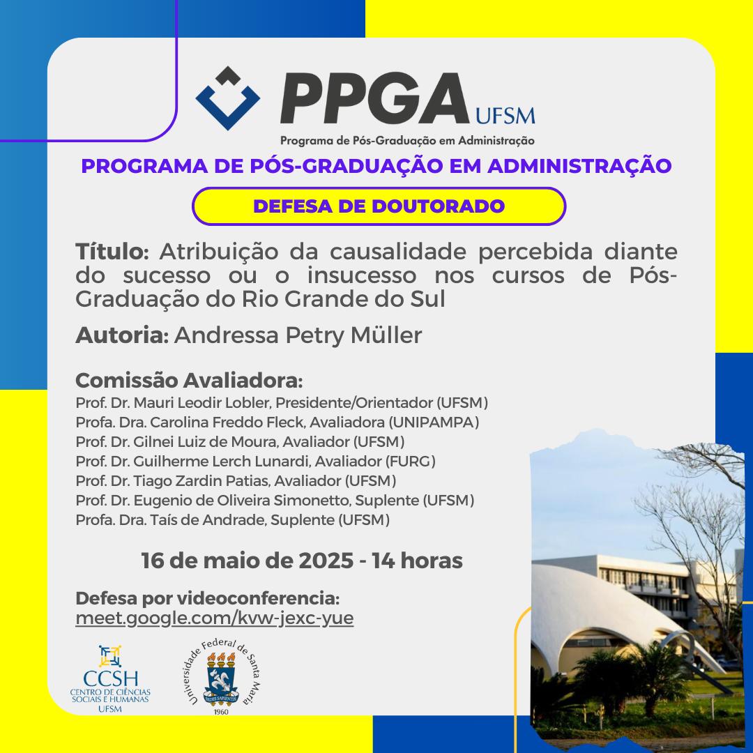 O Programa de Pós-Graduação em Administração divulga a banca de defesa de doutorado da aluna Andressa Petry Müller, com o título “Atribuição da causalidade percebida diante do sucesso ou o insucesso nos cursos de Pós-Graduação do Rio Grande do Sul“, que ocorrerá no dia 16 de maio de 2025, às 14 horas, por videoconferência.