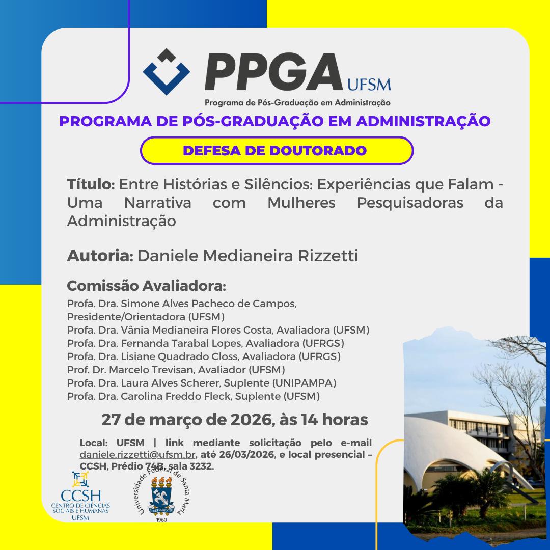O Programa de Pós-Graduação em Administração divulga a banca de defesa de Doutorado da aluna  Daniele Medianeira Rizzetti, com o título “Entre Histórias e Silêncios: Experiências que Falam – Uma Narrativa com Mulheres Pesquisadoras da Administração“, que ocorrerá no dia 27 de março de 2026, às 14 horas.