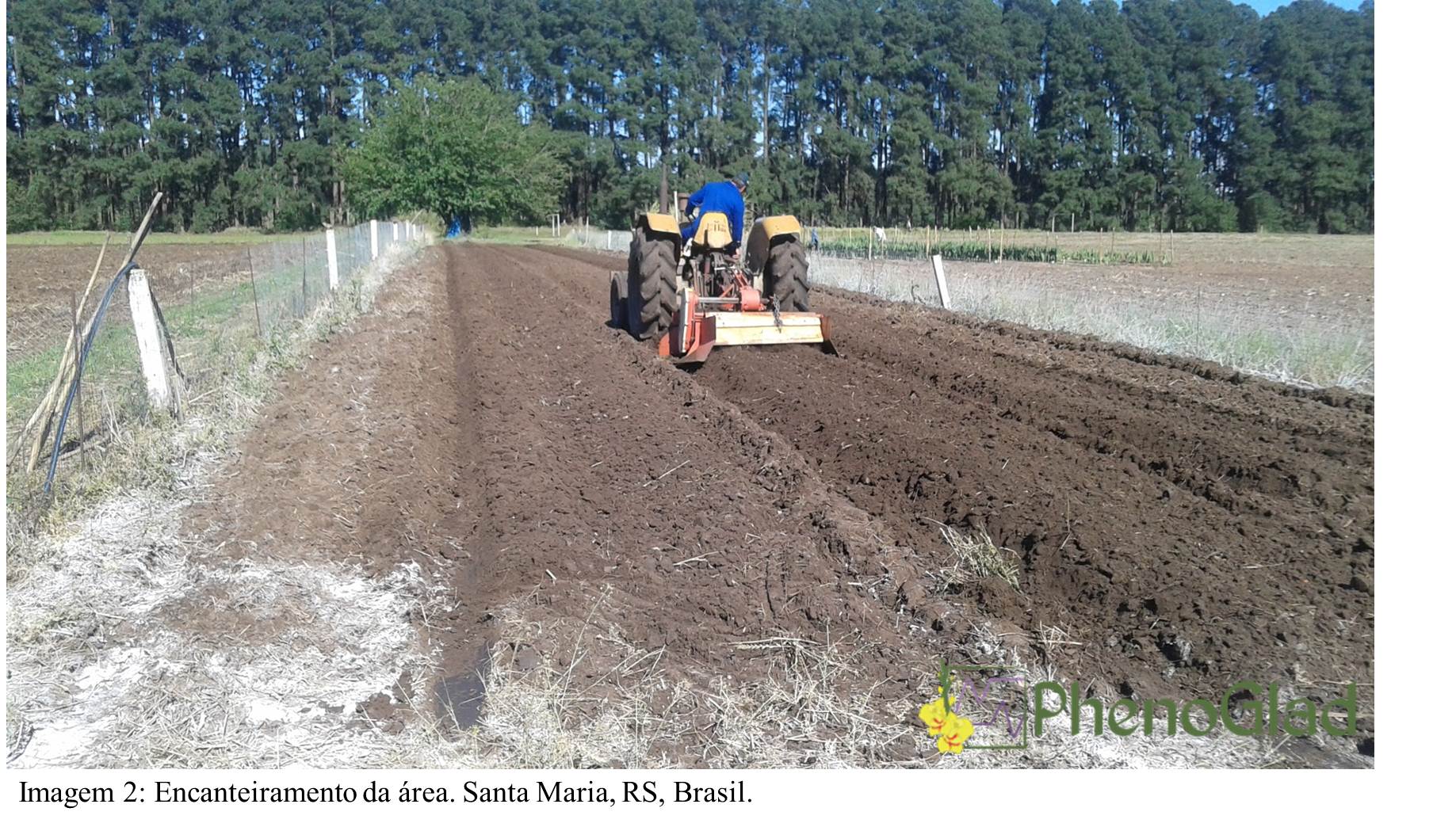 A equipe PhenoGlad de Santa Maria está iniciando os preparativos para implantação de um novo experimento com a cultura do gladíolo, que terá como objetivo testar o efeito de níveis de sombreamento sobre a qualidade das hastes florais de gladíolo. No dia 10/10/2016, foi realizada a aplicação de calcário na área com posterior gradagem para sua incorporação (Imagem 1) e a área foi encanteirada (Imagem 2).  Este experimento faz parte do projeto de tese da aluna de doutorado Lilian Osmari Uhlmann.