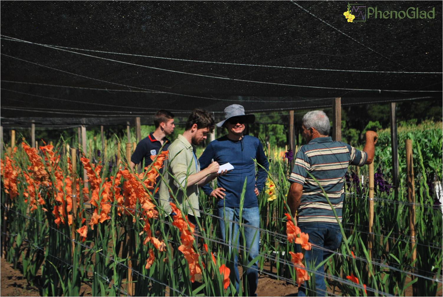 Na manhã do dia 09 de fevereiro de 2017 a equipe PhenoGlad recebeu o produtor de gladíolo sr. Milton Cauzzo para um roteiro técnico na área experimental do Departamento de Fitotecnia da UFSM, onde a equipe PhenoGlad conduz os experimentos. Durante o roteiro, foram trabalhados temas como a implantação da solarização do solo em canteiros com finalidade de combater as doenças de solo através do seu aquecimento e as principais diferenças encontradas em um experimento que testou diferentes profundidades de plantio em gladíolo (5,10, 15, 20 e 25 cm de profundidade). Foi também apresentada uma comparação entre os tratamentos de um experimento que visa estudar as diferenças entre níveis de sombreamento em gladíolo (30 e 50% de sombreamento artificial através de sombrite e sob radiação natural). O produtor pode constatar na prática como o uso do sombreamento pode ser uma alternativa na sua propriedade para melhorar a qualidade de gladíolo cultivado no verão.