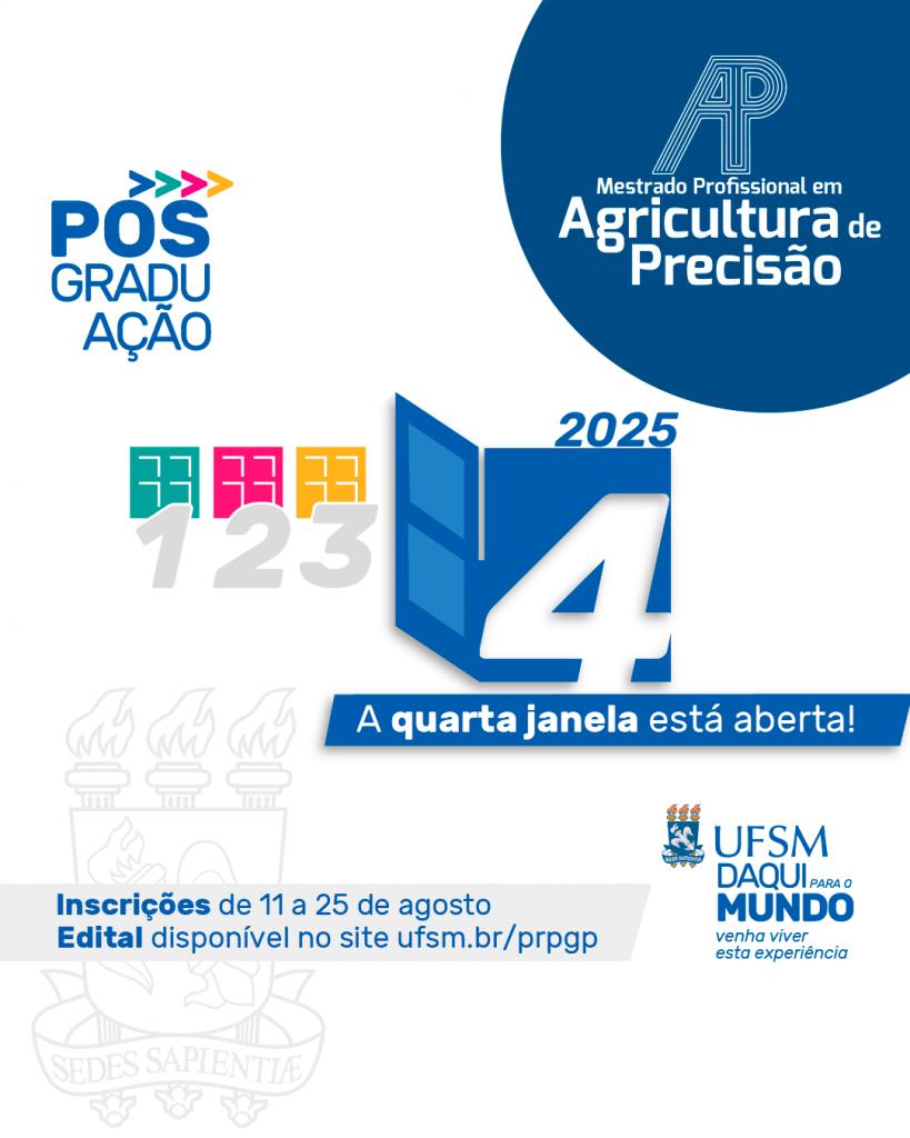 A Coordenação do Programa de Pós-Graduação em Agricultura de Precisão (PPGAP) e a Pró-Reitoria de Pós-Graduação e Pesquisa (PRPGP) tornam público que no período de 11 a 25 de agosto, estarão abertas as inscrições do processo seletivo de Pós-Graduação, em nível de Mestrado Profissional, para ingresso na 4ª janela do ano de 2025.