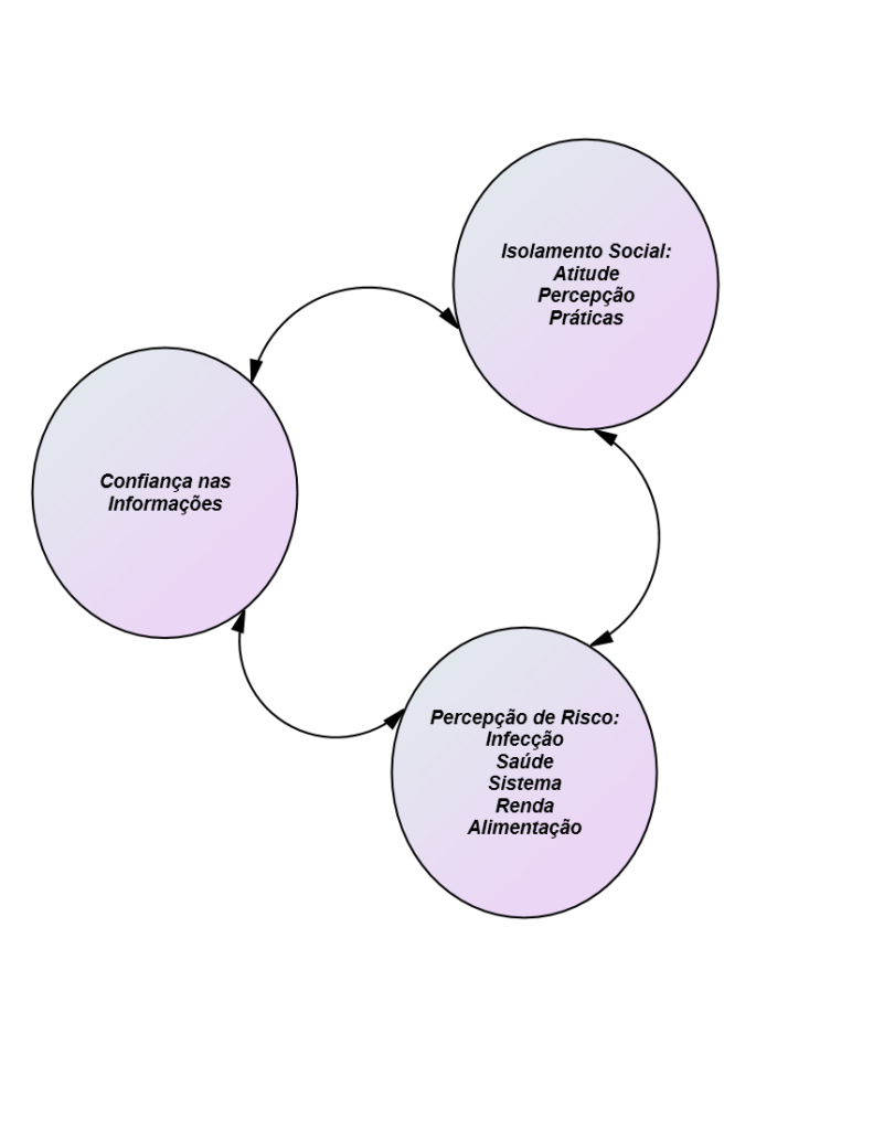 A pesquisa tem por objetivo avaliar a percepção dos brasileiros sobre questões como a participação no isolamento social, a predisposição a adotar as medidas protetivas, o nível de confiança nas informações divulgadas pelas diferentes fontes e a percepção dos riscos associados à pandemia, como riscos de infecção, riscos de saúde, riscos do sistema de saúde, da renda e alimentação. A proposta prevê a aplicação do instrumento em no mínimo 2402 pessoas residentes em todo o território brasileiro. Ademais, após a coleta e análise das informações serão elaboradas e divulgadas medidas educativas baseadas nas percepções dos indivíduos pesquisados a fim de proporcionar uma maior sensibilização sobre o assunto e abordar tópicos para diminuir a propagação da doença. A Figura a seguir representa uma síntese do modelo proposto pelos pesquisadores.