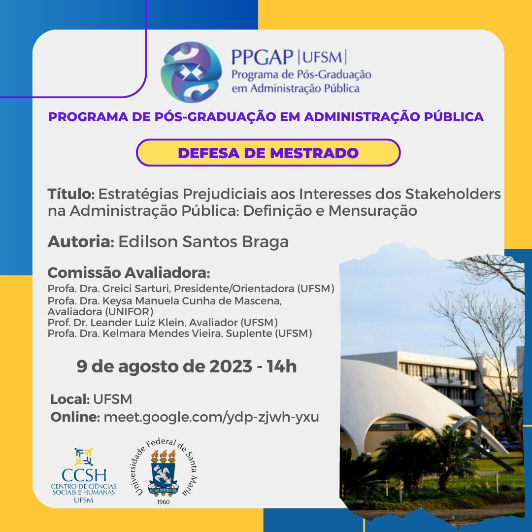 O Programa de Pós-Graduação em Administração Pública divulga a banca de defesa de mestrado do aluno Edilson Santos Braga, com o título “Estratégias Prejudiciais aos Interesses dos Stakeholders na Administração Pública: Definição e Mensuração”, que ocorrerá no dia 9 de agosto, às 14 horas, na UFSM.