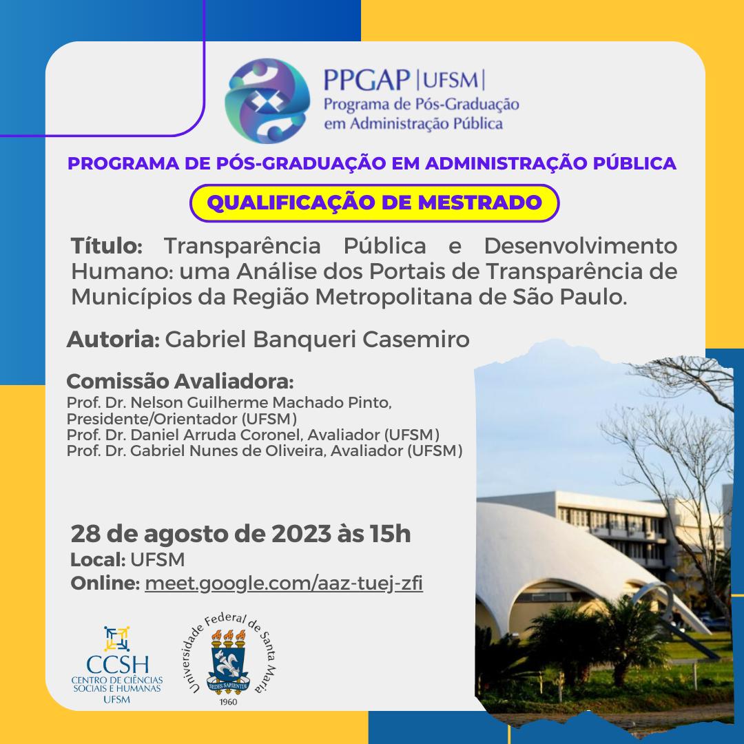 O Programa de Pós-Graduação em Administração Pública divulga a banca de qualificação de mestrado do aluno Gabriel Banqueri Casemiro, com o título “Transparência Pública e Desenvolvimento Humano: uma Análise dos Portais de Transparência de Municípios da Região Metropolitana de São Paulo”, que ocorrerá no dia 28 de agosto, às 15 horas, na UFSM. Link para acesso à videoconferência: meet.google.com/aaz-tuej-zfi.