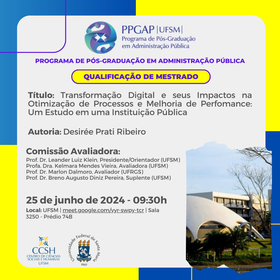 O Programa de Pós-Graduação em Administração Pública divulga a banca de qualificação de mestrado da aluna Desirée Prati Ribeiro, com o título “Transformação Digital e seus Impactos na Otimização de Processos e Melhoria de Perfomance: Um Estudo em uma Instituição Pública“, que ocorrerá no dia 25 de junho de 2024, às 09 horas e 30min, na UFSM, Sala 3250 – Prédio 74B. Link para acesso à videoconferência: meet.google.com/vyr-swpy-tcr