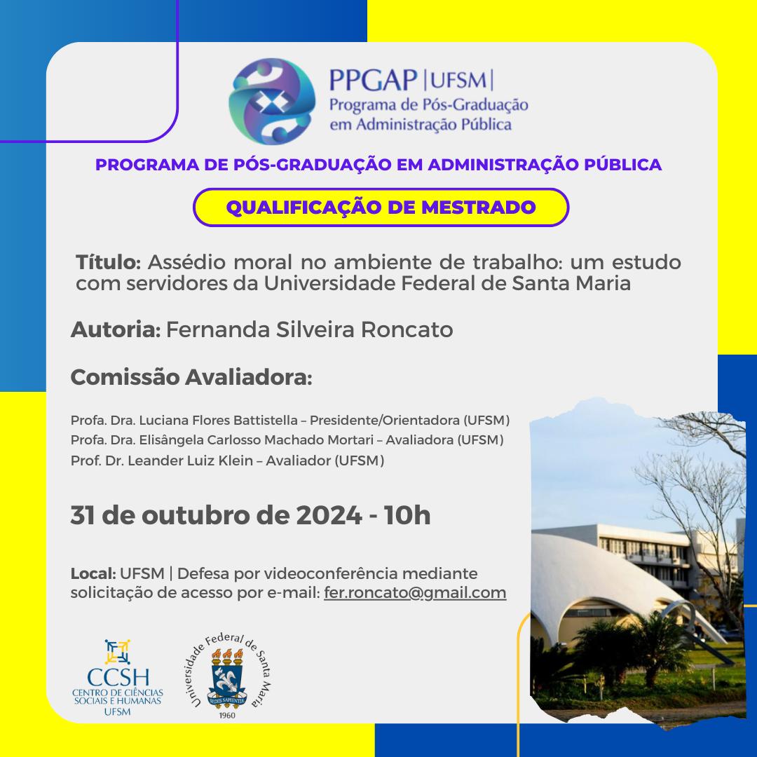 O Programa de Pós-Graduação em Administração Pública divulga a banca de qualificação de mestrado da aluna Fernanda Silveira Roncato, com o título “Assédio moral no ambiente de trabalho: um estudo com servidores da Universidade Federal de Santa Maria“, que ocorrerá no dia 31 de outubro de 2024, às 10 horas. UFSM | Defesa por videoconferência mediante solicitação de acesso por e-mail: fer.roncato@gmail.com